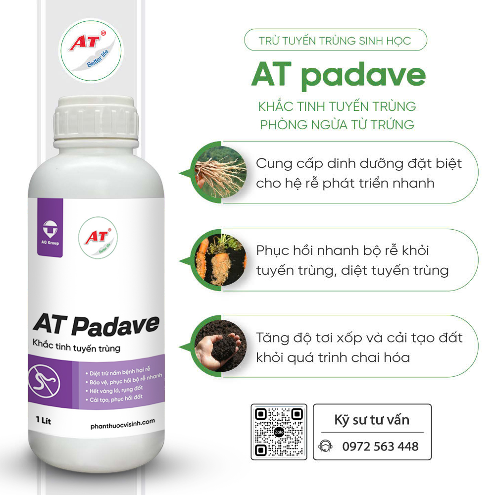 Cơ chế: AT padave là tổ hợp các chủng vi sinh vật có lợi đặc hiệu tuyến trùng, theo khuyến cáo của các nhà khoa học, những chủng vi sinh vật có lợi này sẽ sinh trưởng, phát triển trong đất tạo ra các bẫy sinh học hay di chuyển trong đất bám vào đầu và cơ thể của tuyến trùng, thắt, lây nhiễm rồi phá hủy chết tuyến trùng và trứng.